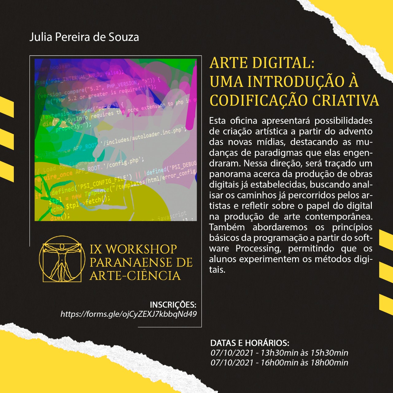 Resumo: Esta oficina apresentará possibilidades de criação artística a partir do advento das novas mídias, destacando as mudanças de paradigmas que elas engendraram. Nessa direção, será traçado um panorama acerca da produção de obras digitais já estabelecidas, buscando analisar os caminhos já percorridos pelos artistas e refletir sobre o papel do digital na produção de arte contemporânea. Também abordaremos os princípios básicos da programação a partir do software Processing, permitindo que os alunos experimentem os métodos digitais.